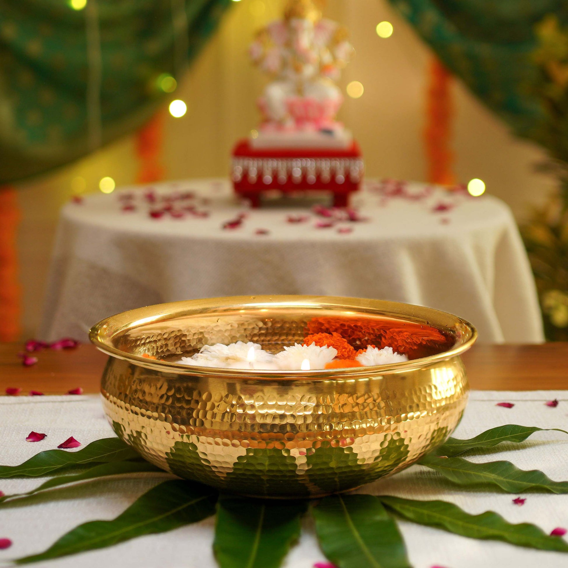 This handcrafted hand-hammered metal urli blends classic elegance and tradition, perfect for urli decor. With its gold finish and textured design, it’s ideal for urli decoration with flowers, water, floating candles, or as a potpourri bowl. Made from high-quality, eco-friendly aluminum, this urli adds charm and warmth to any space.