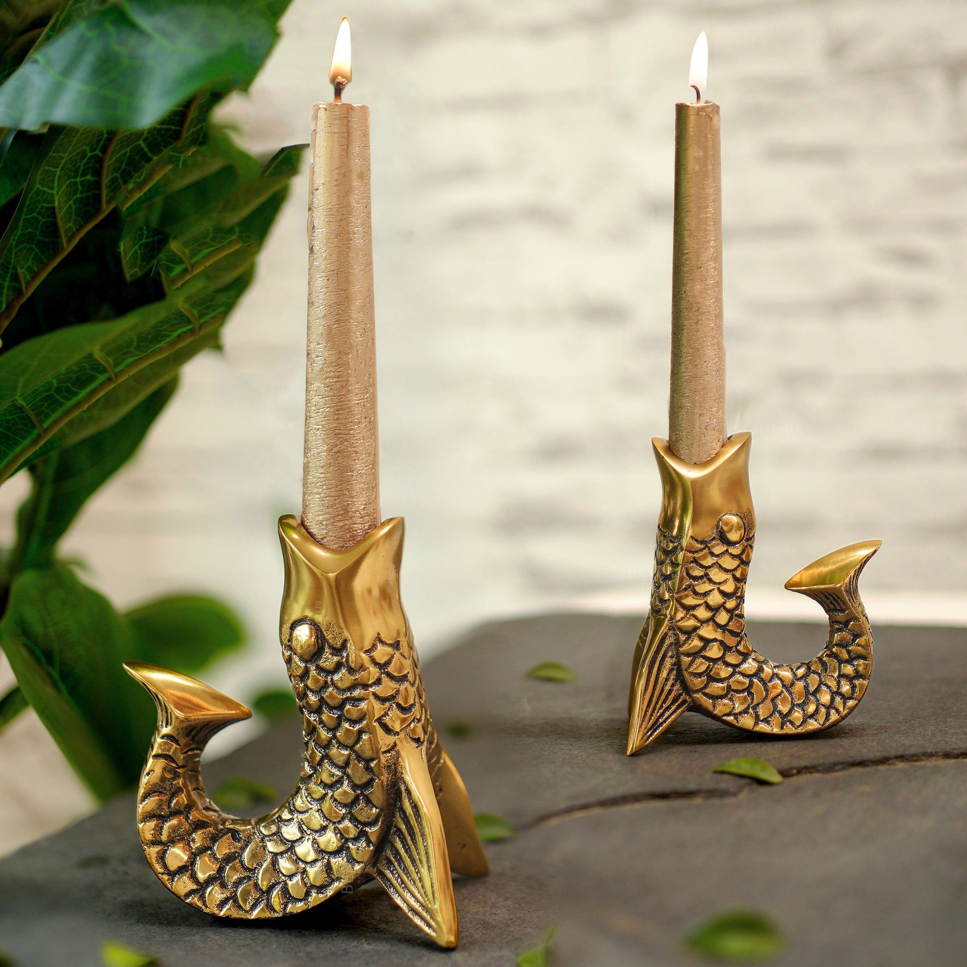 Bring elegance to your décor with this Golden Fish Tail Candle Holder Set. Crafted from premium metal with a radiant finish, it features intricate fish-tail detailing symbolizing prosperity and grace. Securely holds taper candles and enhances ambiance, making it perfect for living rooms, dining spaces, bedrooms, and festive decoration.