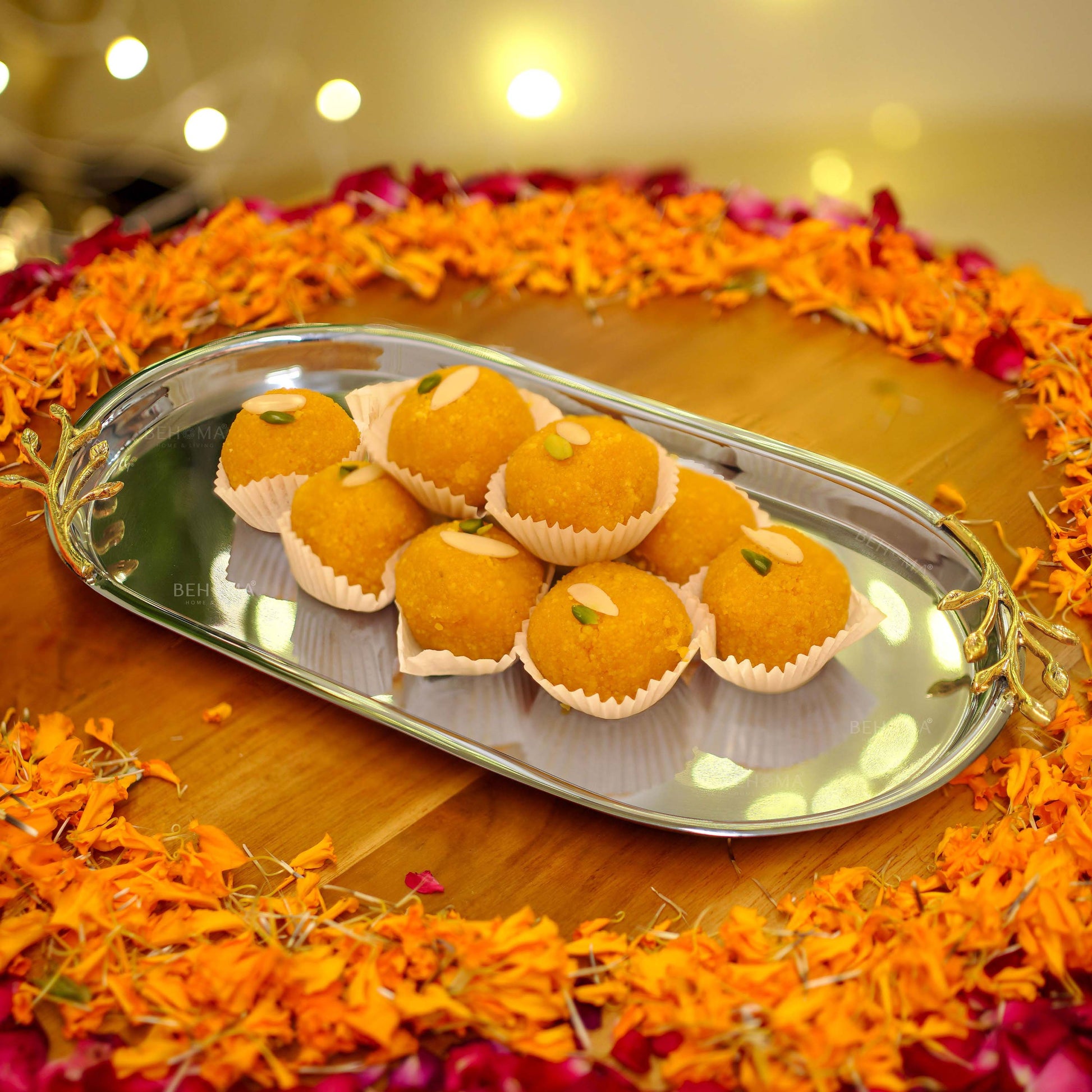 Elegant stainless steel tray featuring a beautifully crafted brass branch handle. Perfect for serving or as a decorative accent to elevate your table setting.